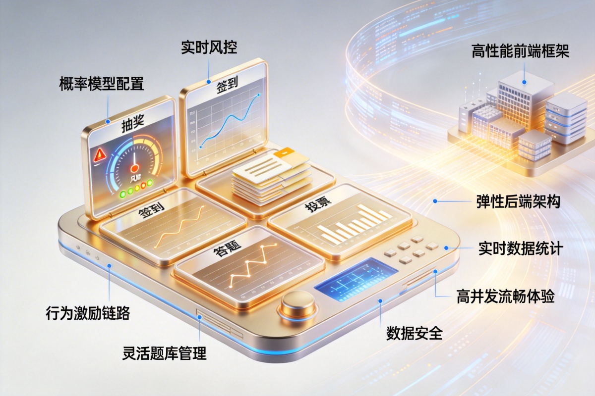 本解决方案集成了抽奖、签到、答题、投票等多种标准化互动形式。抽奖模块支持概率模型配置与实时风控,确保活动公平性与系统稳定性;签到与任务体系通过行为激励链路设计,提升用户粘性;答题与投票组件则具备灵活的题库管理与实时数据统计能力,可用于市场调研与用户分层。所有功能均基于高性能前端框架与弹性后端架构开发,保障高并发场景下的流畅体验与数据安全。