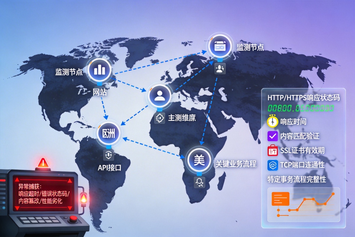 我们的监控服务并非简单的可用性检查。我们部署在全球多个地理位置的监测节点,以预设频率(可自定义)对您的网站、API接口、关键业务流程进行主动探测。监控维度涵盖HTTP/HTTPS响应状态码、响应时间、内容匹配验证、SSL证书有效期、TCP端口连通性以及特定事务流程的完整性。任何偏离预设阈值的异常,如响应超时、错误状态码、内容篡改或性能劣化,都将被系统即时捕获。