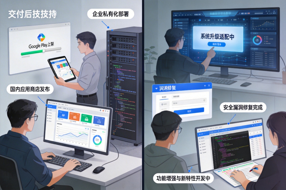 我们协助客户完成应用在Google Play、国内各大应用商店以及企业私有化渠道的发布与上架流程,应对不同平台的政策与技术要求。交付后,我们提供持续的技术支持与版本迭代服务,包括系统升级适配、安全漏洞修复、功能增强与新特性开发,确保应用能够与时俱进,持续满足业务发展需求。
