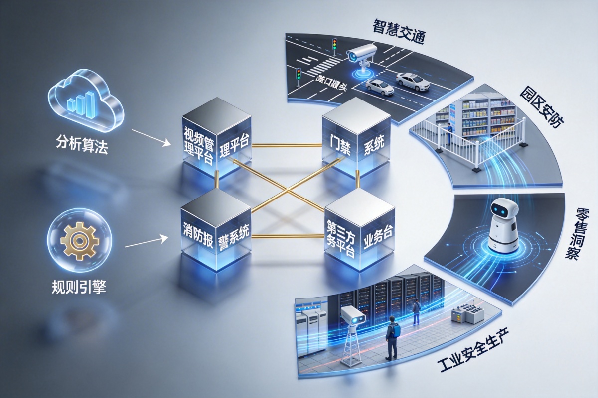 本解决方案设计遵循模块化与开放性原则,支持与主流视频管理平台、门禁系统、消防报警系统及第三方业务平台无缝集成。分析算法与规则引擎可根据不同行业场景(如智慧交通、园区安防、零售洞察、工业安全生产)进行定制化训练与部署,确保技术能力紧密贴合实际业务需求,构建端到端的智能监控体系。