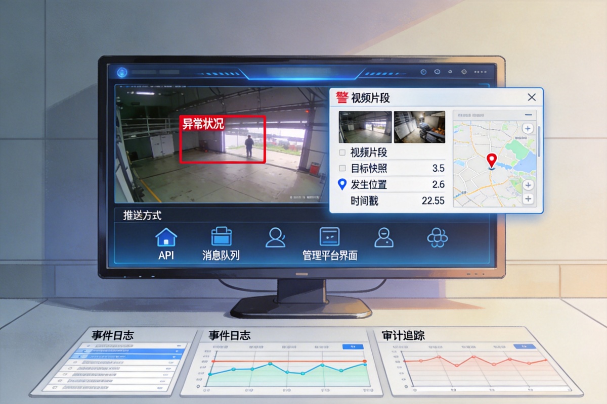 基于预设或机器学习生成的规则模型,系统能够自动识别监控场景中的异常状况,并触发实时告警。告警信息可关联视频片段、目标快照、发生位置及时间戳,通过API、消息队列或管理平台界面即时推送,确保关键事件得到快速响应。系统提供完整的事件日志与审计追踪,支持事后高效检索与复盘分析。